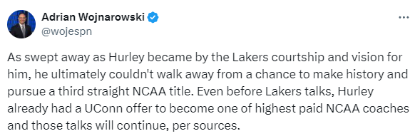 woj揭秘,尽管赫尔利被湖人队的追求和球队对他的期待所打动,但他最终还是无法放弃创造NCAA三连冠历史的机会。