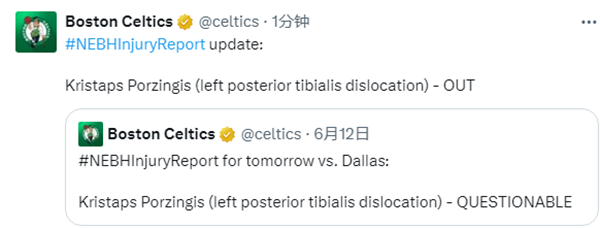 178直播讯 北京时间6月13日,NBA总决赛G3一触即发,凯尔特人官宣坏消息,波尔津吉斯因左胫骨后脱位而缺席第三场,东契奇继续带伤出战。