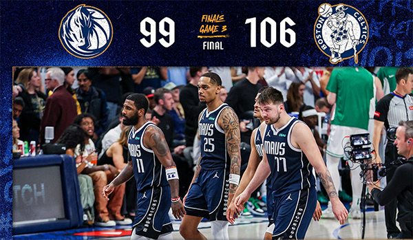 178直播讯 NBA总决赛G3打得跌宕起伏,凯尔特人106-99击败独行侠,大比分3-0领先,斩获总冠军点,再赢一场就可以夺冠。独行侠开场9-2领先,一度领先凯尔特人两位数,在塔图姆的带领下,双方鏖战,凯尔特人上半场落后1分。第三节,杰伦布朗单节轰下15分,凯尔特人领先对手15分,并且在第四节初期顺利将差距拉大到21分。不过主场作战的独行侠不放弃,一波22-2缩小分差,东契奇6次犯规被罚下,凯尔特人顶住压力,布朗和怀特关键球,取得胜利,3-0领先的情况下,夺冠在即。