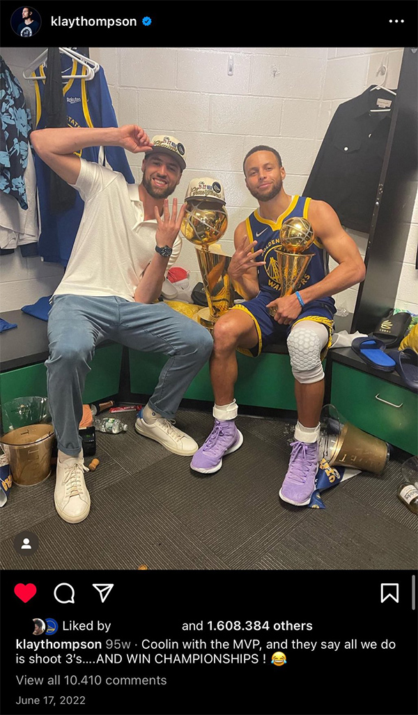 2022年勇士夺冠,库里全票夺得生涯第一座FMVP奖杯,夺冠后汤普森曾晒出在更衣室中与库里一起庆祝夺冠的合影,如今这条动态已经被汤普森删除;汤普森还取关了勇士官方账号。