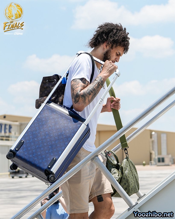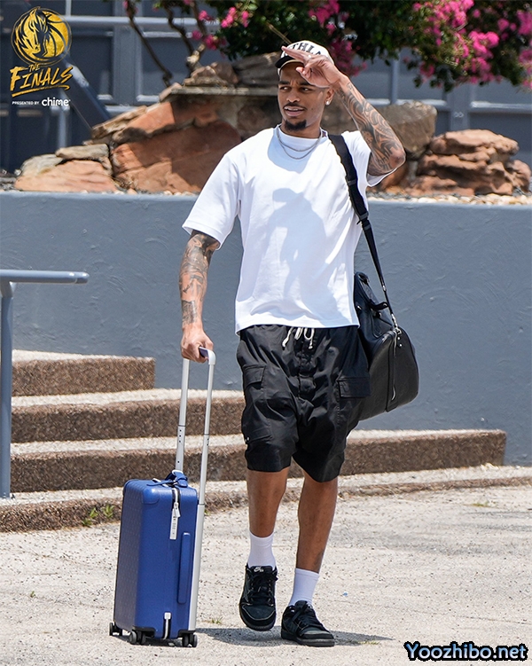 PJ-华盛顿推着蓝色行李箱,黑色短裤搭配白色T恤,G4首发上场13分钟,4中2拿到6分2篮板。
