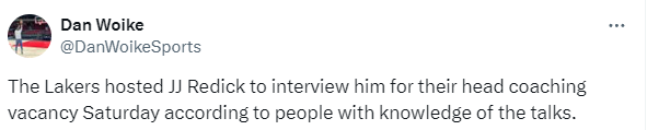 Woike还表示,这一步对雷迪克来说很重要,他一直是球队寻找教练的核心人物;在NBA选秀大会前,雷迪克首次与湖人总经理佩林卡、老板珍妮-巴斯和其他湖人关键人物会面,他被认为是湖人新帅的领跑者,也可能是会见湖人高管的最终候选人。