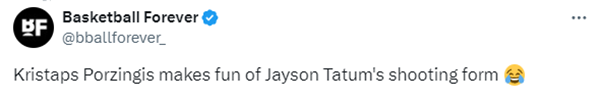 今日,凯尔特人和独行侠两队都积极备战总决赛第五场,波尔津吉斯参加训练并且被列为出战成疑,期间波津疑似模仿塔图姆投篮一幕引热议,美媒Basketball Forever调侃:他取笑塔图姆的投篮姿势(笑哭表情)。