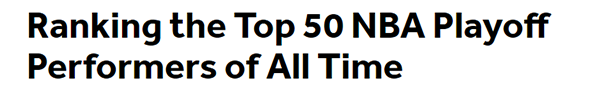 据悉,根据胜利贡献值(Win Share)、每48分钟胜利贡献值、球员效率评级、每场比赛得分、篮板和助攻的简单组合以及上场时间作为基准,将NBA历史所有1758名生涯季后赛出战时间大于100分钟的球员都按这五个类别的平均排名进行排序,选出NBA历史季后赛50大巨星。