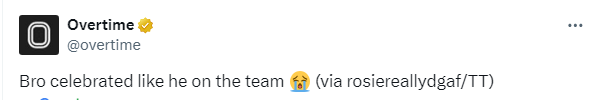 身穿杰伦-布朗7号球衣的男球迷在家中狂喷香槟庆祝,把自己浇得浑身湿透,笑着笑着就哭了,蹲在地上掩面哭泣;美媒Overtime调侃:这兄弟就像他在绿军队中庆祝一样。