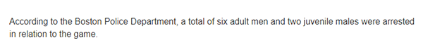 还有球迷爬上路标以及坐在红绿灯上抽雪茄庆祝,不过有些球迷因过度庆祝摊上事了,据报道,波士顿警察局称,共有6名成年男子和2名未成年男子在这一次狂欢中被逮捕,有些路标被损坏了。