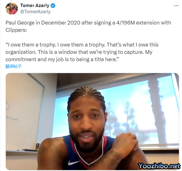 快船记者Tomer Azaly晒出乔治2020年与快船签下4年1.96亿美元大合同后的采访视频,乔治表示:我欠球队一座奖杯,这是我需要做到的事情,我的承诺和我的工作都是为快船带来总冠军。