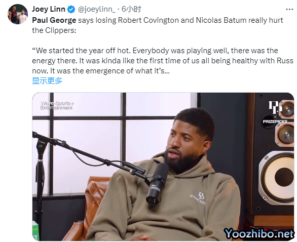 谈到球队送走巴图姆、科温顿换来哈登,乔治表示:我们这赛季开局不错。每个人都打得很好,场上充满了活力。这有点像我们第一次和威少一起健康地打球。这就是我和威少在一起打球的感觉,我健康,科怀(莱昂纳德)健康,就像是一个全新的开始;然后我们交易得到了哈登,我们表现挣扎不是他的错,但我们失去了科温顿和巴图姆。现在你拥有了哈登,他在进攻端非常有天赋,现在是我和科怀,我们变成了干脏活累活的家伙。