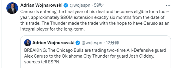 178直播讯 北京时间6月21日,NBA休赛期第一笔交易来了,据名记woj报道,消息人士透露,公牛将卡鲁索送至雷霆,换回约什-基迪;从交易之日起六个月内,卡鲁索有资格获得一份为期四年、价值约 8000 万美元的续约合同。