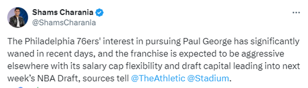 据名记Shams报道,76人对追求保罗-乔治的兴趣在最近几天明显减弱,预计76人将利用球队灵活的薪资空间和选秀资产在其他方面积极运作,为即将到来的NBA选秀做准备。