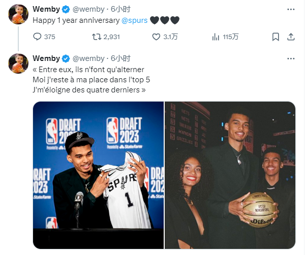 178直播讯 北京时间6月23日,去年今日,文班亚马被马刺用状元签选中从而开启NBA生涯;今日文班亚马发推庆祝当选状元一周年,晒照并写道:一周年快乐@马刺!