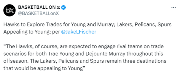 Jake Fischer报道称,老鹰队预计将在整个休赛期与对手球队就特雷-杨和德章泰-穆雷的交易方案进行接触。联盟消息人士透露,湖人队、鹈鹕队和马刺队仍然是对杨有吸引力的三个目的地,选秀球队并没有低估马刺交易得到状元签的可能性,这可能会为老鹰队选择克林根打开大门。