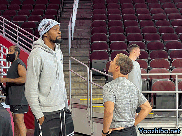 杜兰特身穿黑色球鞋和一套黑色短裤、短袖和紧身裤,持球突破杀到禁区后急停晃飞防守人,然后迎着另一个防守人的补防把球投进,杜兰特训练时哈登一直看着。