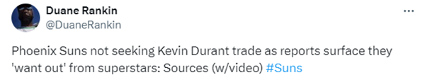 今日太阳队记Duane Rankin报道,尽管火箭拥有足够的选秀权来追求杜兰特,但太阳不会交易杜兰特,布克、比尔与杜兰特三巨头将继续并肩作战。