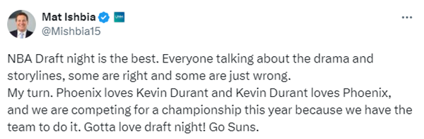 太阳老板马特-伊什比亚发推辟谣:NBA选秀夜是最精彩的。每个人都在讨论各种戏剧性事件和故事情节,有些是对的,有些则是错的。现在轮到我了。太阳爱凯文-杜兰特,凯文-杜兰特也爱太阳,并且我们今年正在争夺冠军,因为我们有能够实现这一目标的球队。一定要爱上选秀夜!太阳加油!