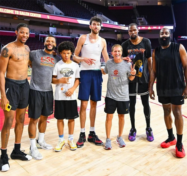 NBA众星相约一起训练,据报道,今日太阳球星杜兰特与快船球星哈登、雷霆球星霍姆格伦现身南加州大学的球馆中,他们一起打磨进攻技巧。