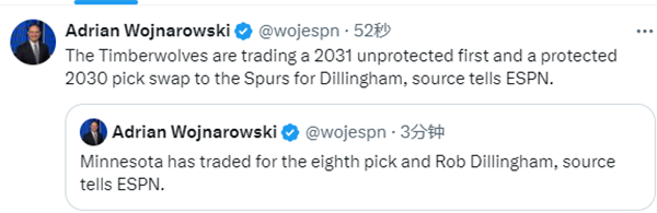 马刺选中迪林厄姆后把他交易到森林狼,据名记woj报道,马刺把迪林厄姆送去了森林狼,换来2031年无保护的首轮选秀权和2030年受保护的选秀权互换权。