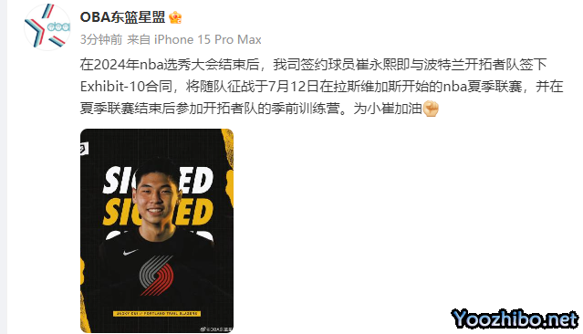 经纪公司宣布,在2024年nba选秀大会结束后,我司签约球员崔永熙即与波特兰开拓者队签下Exhibit-10合同,将随队征战于7月12日在拉斯维加斯开始的nba夏季联赛,并在夏季联赛结束后参加开拓者队的季前训练营。为小崔加油!