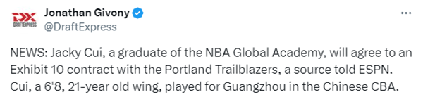 178直播讯 北京时间6月28日,2024年NBA选秀正式落下帷幕,中国球员崔永熙遗憾落选,不过据NBA选秀专家Jonathan Givony报道,崔永熙将与开拓者签下Exhibit10合同,这是一份训练营合同。