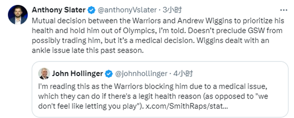 勇士队记Slater转发了相关报道并报道:我被告知,(缺席巴黎奥运会)这是勇士和维金斯彼此共同(Mutual)的选择,他们决定优先考虑他(维金斯)的健康问题。(缺席奥运)并没有排除勇士交易他的可能,这只是一个‘医疗决定(medical decision)’。维金斯在上个赛季末一直在处理脚踝相关问题。