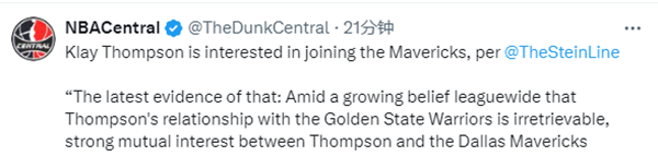 名记Marc Stein报道,独行侠把小哈达威交易到活塞后,他们的薪资有了一些灵活性。独行侠打算在克莱-汤普森成为自由球员后,探索签下他的可能性。双方相互有意,独行侠成克莱最可能下家。