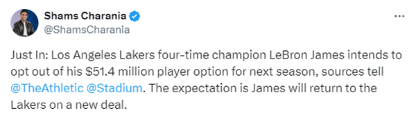 178直播讯 北京时间6月30日,据名记shams报道,詹姆斯已经决定拒绝执行与湖人最后一年价值5140万美元的球员选项,跳出合同成为自由球员,预计将与湖人续约;名记Haynes报道詹姆斯考虑降薪续约,旨在帮助球队补强从而继续冲冠。