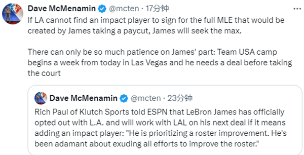 詹姆斯降薪前提曝光,湖人随队记者Dave McMenamin报道,自由球员勒布朗-詹姆斯的经纪人里奇-保罗透露,如果詹姆斯通过在新合同中的降薪创造的全额中产薪资(1295万美元)空间无法让湖人签下一名有影响力的球员,詹姆斯将寻求顶薪合同。
