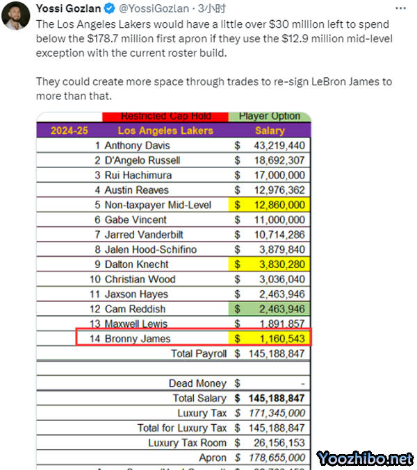 湖人队大名单现有球员为——詹姆斯(年薪待定)、浓眉(4322万)、拉塞尔(1869万)、八村垒(1700万)、里夫斯(1298万)、文森特(1100万)、范德比尔特(1071万)、席菲诺(388万)、克内克特(383万)、伍德(304万)、海斯(246万)、雷迪什(246万)、刘易斯(189万)、布朗尼(116万)