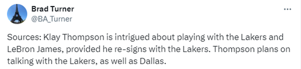 Marc Stein报道,詹姆斯希望湖人能够给出一个比独行侠更具竞争力的报价以签下克莱。