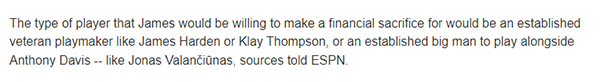 Dave McMenamin报道,詹姆斯愿意做出经济牺牲的球员类型将是詹姆斯-哈登或克莱-汤普森这样的老将组织核心,或者是安东尼-戴维斯身边的老将大个子球员——比如乔纳斯-瓦兰丘纳斯。