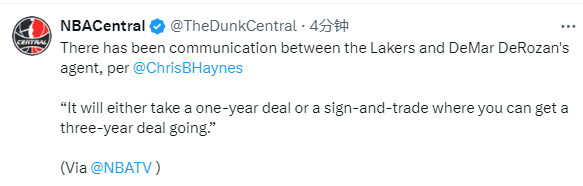 名记Chris报道,湖人队已经与德罗赞的经纪人进行了沟通 ,双方要么签一份一年合同,要么通过先签后换的方式签一份三年合同。