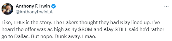 据湖人记者Anthony F Irwin报道,湖人认为他们签下汤普森已经稳了,听说湖人报价4年8000万美元,可汤普森仍然说他宁愿加盟独行侠。