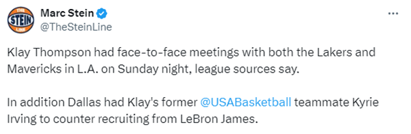 名记Marc Stein报道,汤普森周一在洛杉矶与湖人和独行侠都进行过面对面交流,而且欧文也参与了对克莱的招募从而对抗詹姆斯的招募。