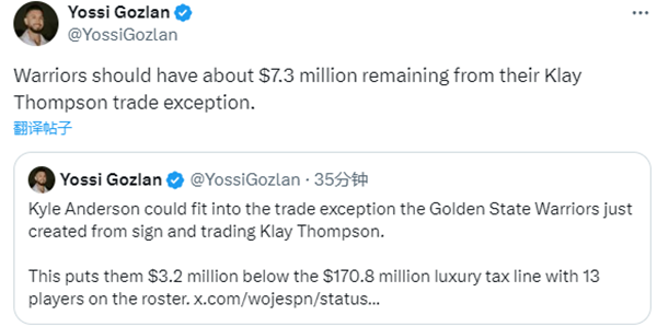 此前勇士先签后换把汤普森交易到独行侠,换来两个次轮选秀权并且获得1630万美元的交易特例;如今勇士用交易特例的一部分引援李凯尔,薪资专家表示勇士的汤普森交易特例还剩余大约730万美元,目前勇士大名单上有13名球员,总薪资比1.708亿的奢侈税线低了320万美元。