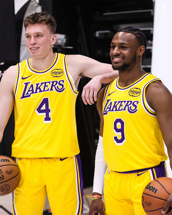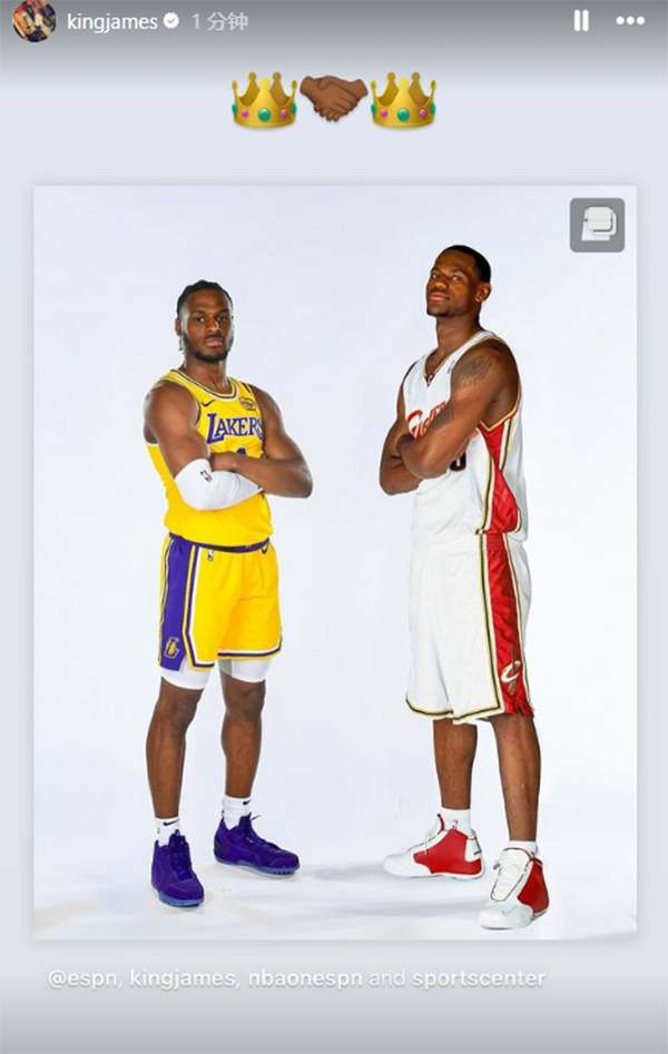 湖人官方晒出詹姆斯父子的合影,配文写道:家人——39岁詹姆斯身穿黑色连帽卫衣和短裤,布朗尼身穿湖人9号球衣,老詹把手臂搭在布朗尼的肩膀上,布朗尼抱着篮球,父子二人都满脸笑容,这是布朗尼加盟湖人后,詹姆斯父子的首张合影,也是布朗尼首次身穿湖人9号球衣亮相。