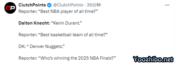 178直播讯 北京时间7月4日,湖人17号秀多尔顿-克内克特的一番争议言论被扒出,在节目中直言杜兰特是历史最佳,掘金是历史最佳球队。