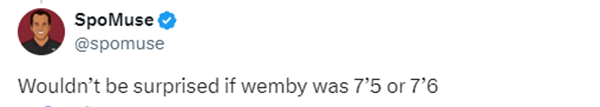 有球迷表示文班亚马身高2米26或者2米28也不令人惊讶,还有球迷晒照表示文班的身高令勒布朗印象深刻。
