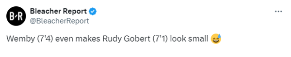 文班亚马的官方身高是2米24,戈贝尔官方身高2米16,两人官方身高相差8公分;在法国男篮大合影中,文班明显比戈贝尔高出将近一个头,美媒纷纷转发,《露天看台》发推调侃:文班亚马让戈贝尔显得矮小。