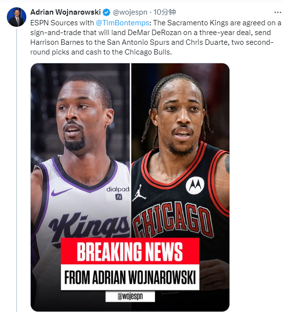 178直播讯 北京时间7月7日,据TA记者Shams Charania报道,公牛、马刺和国王达成三方交易,德玛尔-德罗赞将以先签后换的方式加盟国王。