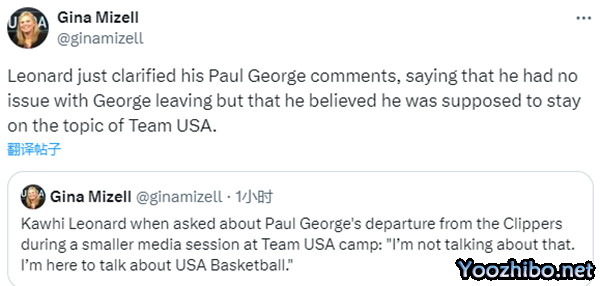 据美记者Gina Mizell报道,小卡澄清表示:我对乔治的离开没有意见;随后小卡强调他应该继续谈论与美国男篮有关的话题。