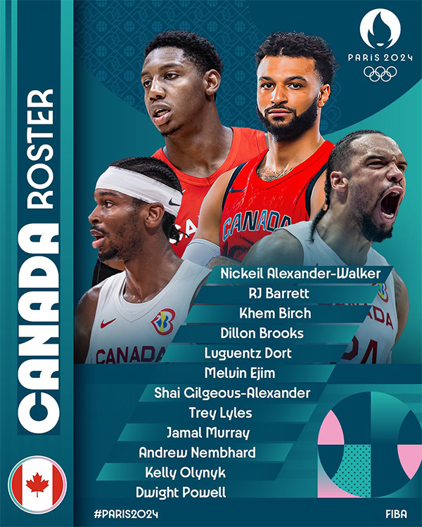 加拿大男篮已经公布了参加巴黎奥运会的12人名单:亚历山大-沃克、巴雷特、伯奇、狄龙、多特、埃吉姆、亚历山大、莱尔斯、贾马尔-穆雷、内姆哈德、奥利尼克和德怀特-鲍威尔;值得一提的是,奥利尼克将担任队长。