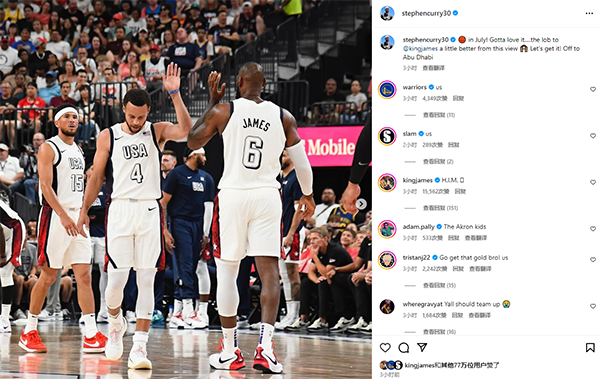 库里也在Ins上晒出詹库连线,配文写道:七月的篮球,你不得不爱上从这个视角看给詹姆斯送出的空接,让我们冲啊,出发去阿布扎比。