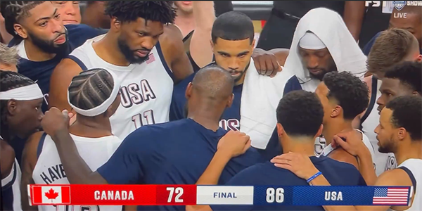 热身赛对阵加拿大男篮,美国男篮开场1-11打得十分糟糕,不过随着比赛的进行,美国队越打越顺,第二节27-12扭转局面,第三节28-21拉开分差,最终美国男篮轻松拿下比赛;詹库连线点燃球馆,浓眉打出统治力,不过恩比德仅仅只打了12分钟就5犯被罚下。