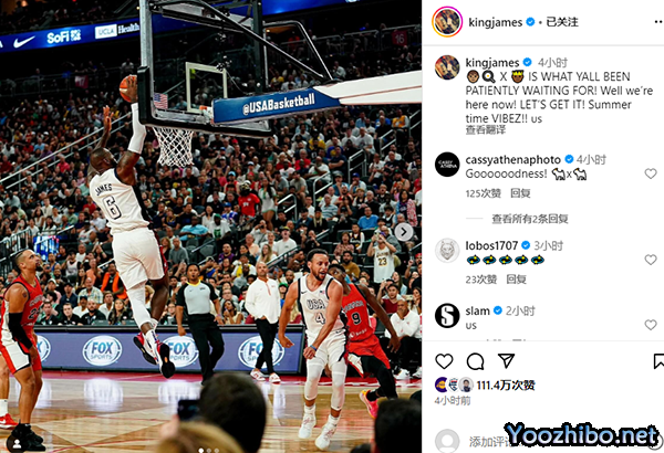 詹姆斯的动态获得超过110万的点赞,美国男篮官方、湖人官方都为老詹点赞。