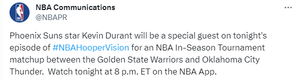 杜兰特曾在勇士打过三年,联手库里、汤普森和格林夺得两座总冠军以及两次夺得FMVP;本赛季杜兰特重返勇士时,获勇士队播放视频致敬;NBA锦标赛勇士首战,杜兰特将在节目中全程观看。