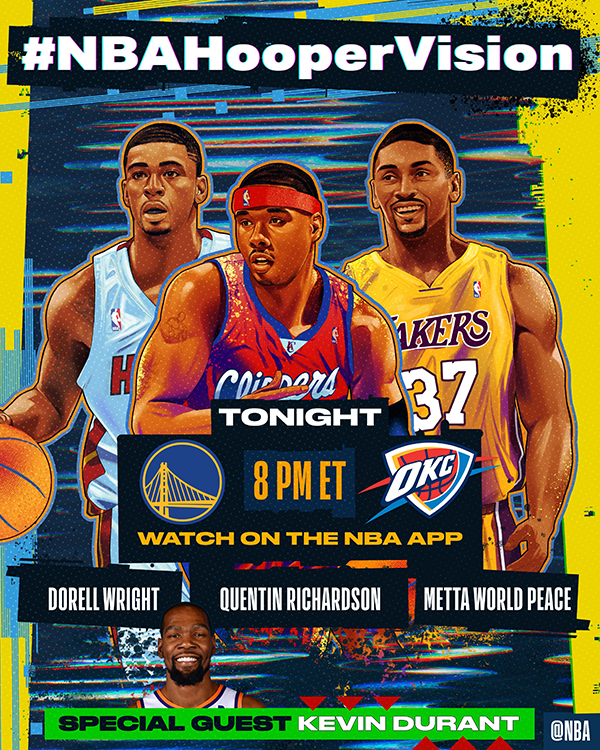 NBA官方确认,杜兰特将作为特邀嘉宾,在节目中和慈善世界和平(阿泰斯特)等人一起观看勇士和雷霆的比赛。