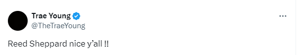 老鹰球星特雷-杨发推盛赞火箭探花:大家听好了,我想说,里德-谢泼德真是太棒了。