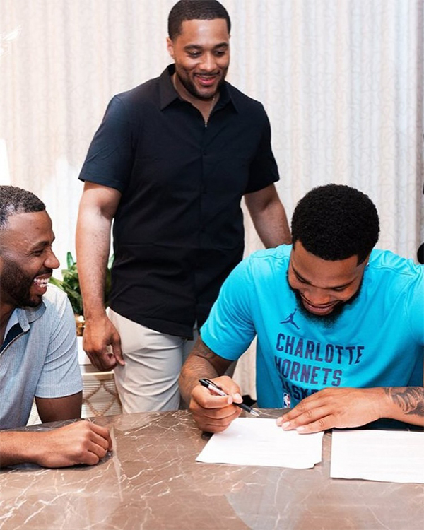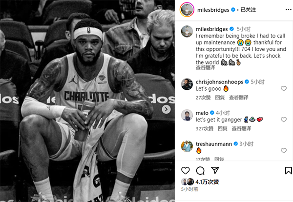 178直播讯 北京时间7月15日,夏洛特黄蜂正式宣布与迈尔斯-布里奇斯完成签约,晒照并且表示欢迎回归;布里奇斯晒签约画面,并且发声直言:我曾破产,非常感激能够回归。
