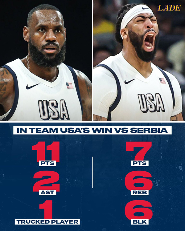 末节詹姆斯和库里等首发又上场打了一会,库里继续输送三分,39岁的詹姆斯溜底线空接暴扣,此时老詹抖肩霸气庆祝;比赛还剩3分钟,美国男篮鸣金收兵,最终26分大胜塞尔维亚,热身赛喜提三连胜。
