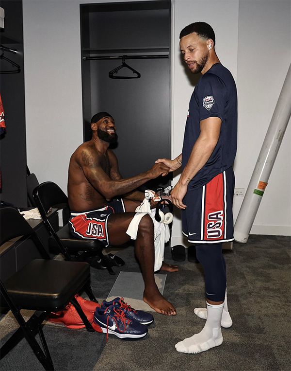 三场热身赛,美国男篮用了三套首发,詹姆斯、库里和恩比德一直首发,杜兰特因小腿伤势连续缺席比赛;今日26分大胜塞尔维亚,库里24分大爆发,詹姆斯暴扣,浓眉7分6盖帽6篮板、阿德巴约17分7篮板都立功,赛后老詹在球员通道直呼阿德巴约与库里是新版水花兄弟。